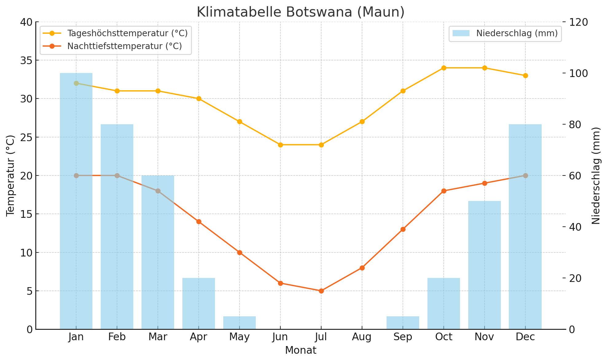 Die beste Reisezeit ist von Mai bis Oktober – Trockenzeit mit angenehmen Temperaturen, ideal für Tierbeobachtungen.