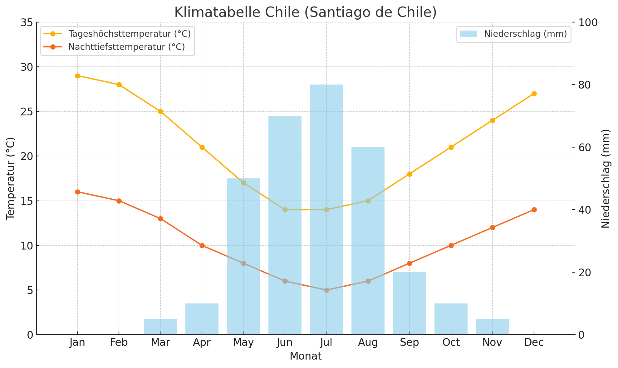 Die beste Reisezeit ist von Oktober bis März für Patagonien; von Mai bis September für die Atacama-Wüste und den Norden.