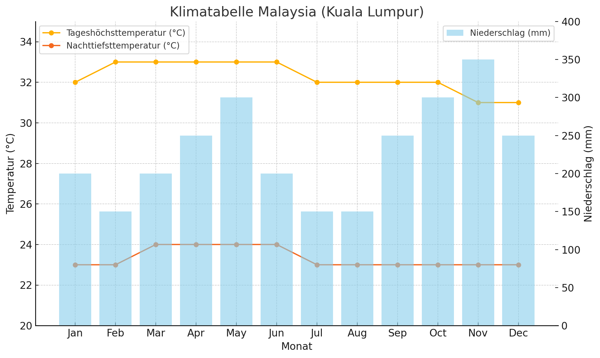 Malaysia ist ein Schmelztiegel der Kulturen – Malaysier, Chinesen und Inder prägen das Land. Respektiere religiöse Bräuche, insbesondere in Moscheen und Tempeln. Beim Betreten von Häusern und religiösen Stätten ist das Ausziehen der Schuhe üblich.