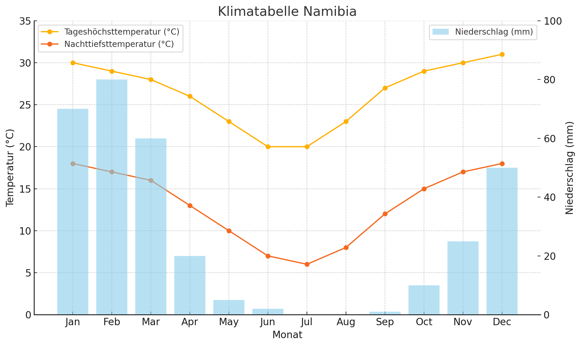 • Währung: Namibischer Dollar (NAD), oft auch Südafrikanischer Rand akzeptiert