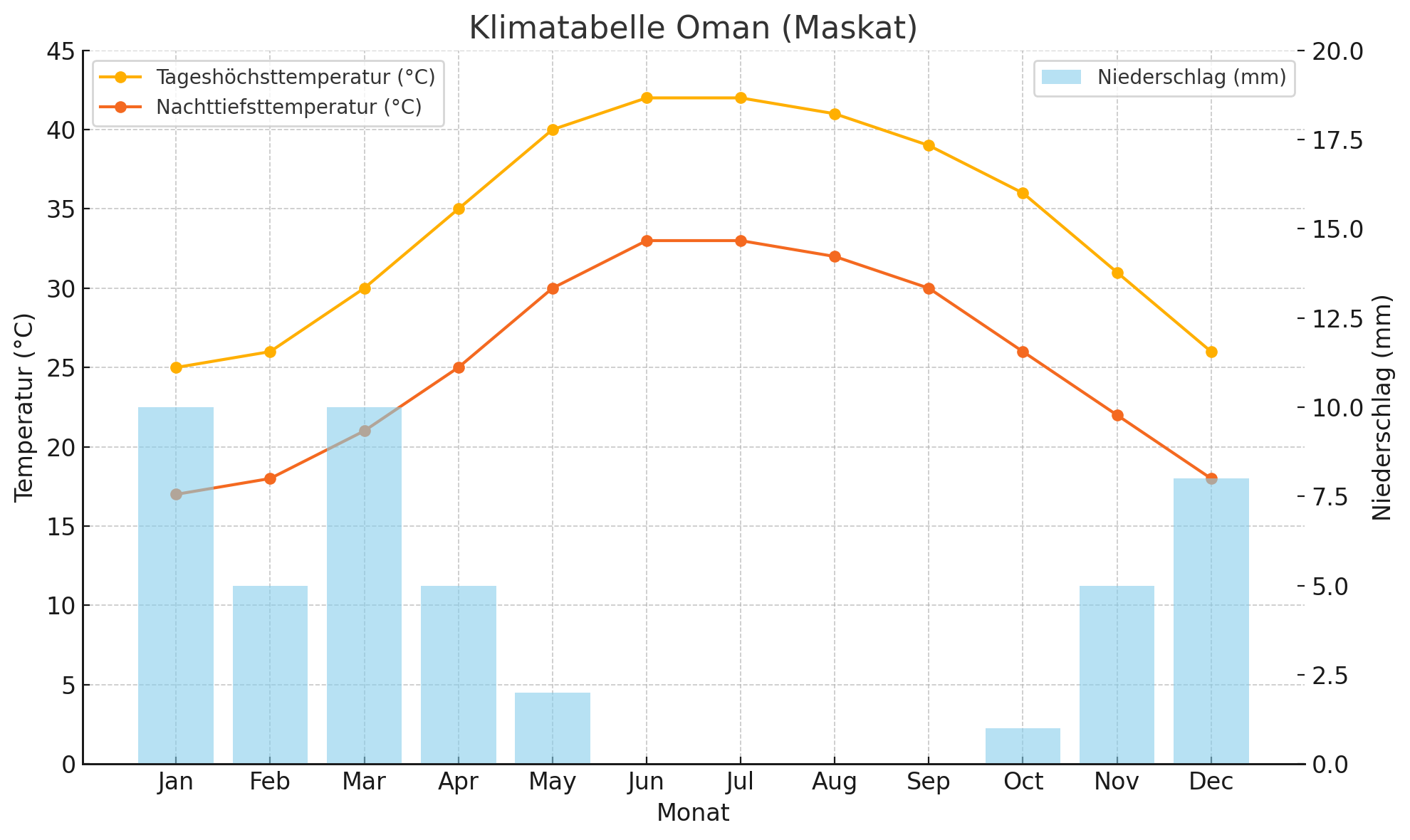 Omaner sind für ihre Gastfreundschaft bekannt. Respektiere die islamischen Bräuche, insbesondere während des Ramadans. Traditionelle Kleidung wie die Dishdasha (Männer) und Abaya (Frauen) sind im Alltag weit verbreitet.