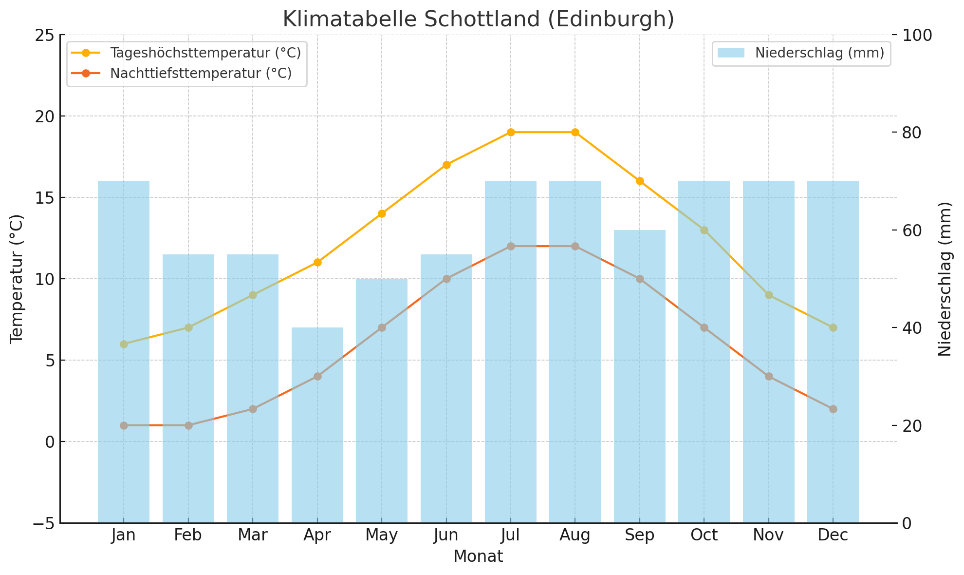 Schottland ist stolz auf seine reiche Geschichte und Kultur. Dudelsäcke, Kilts und Ceilidhs (traditionelle Tänze) sind ein wichtiger Teil des schottischen Lebens. Gastfreundschaft wird großgeschrieben.