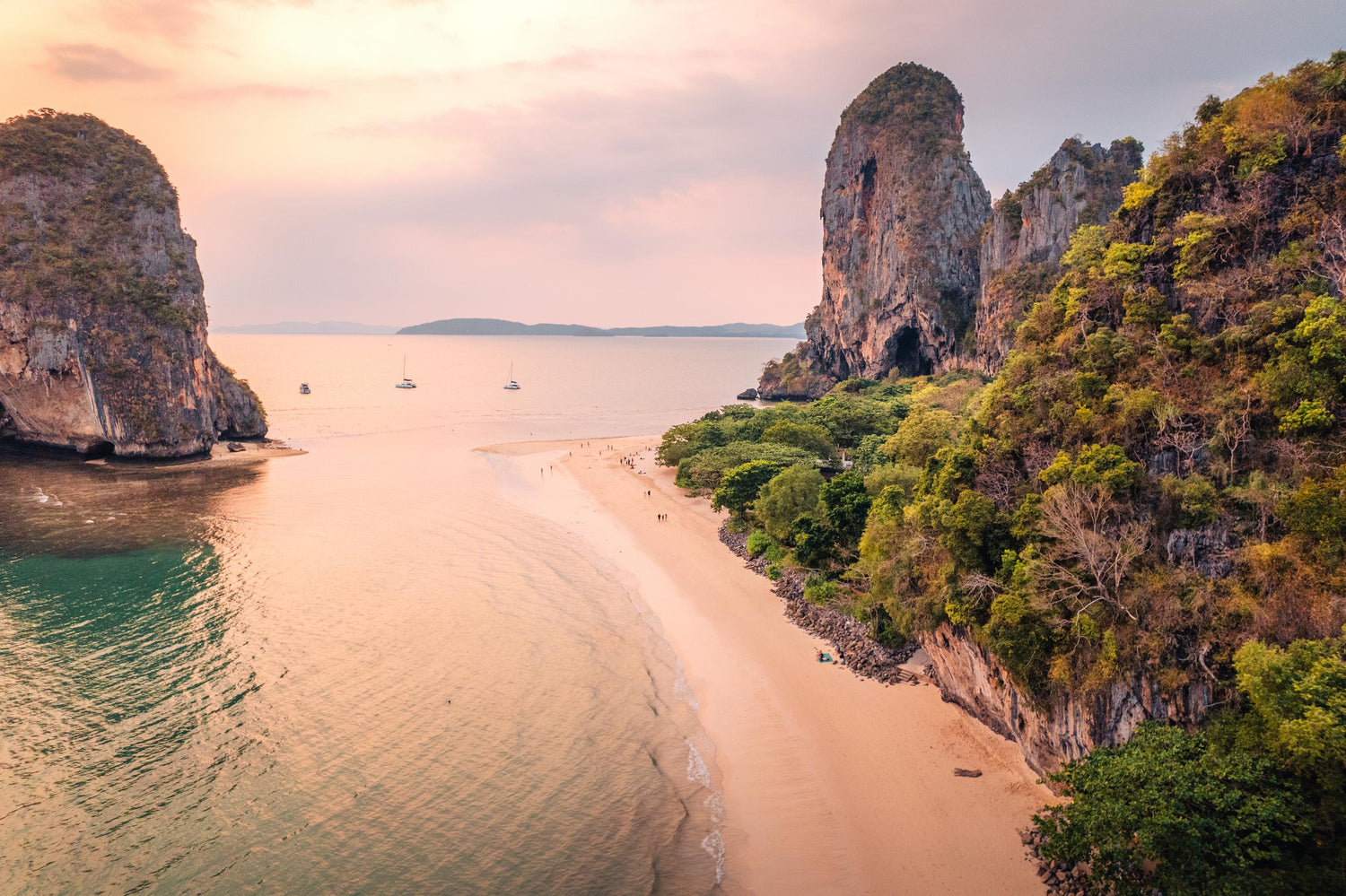 Die Gegend um Krabi ist berühmt für ihre atemberaubende Landschaft. Fahre mit dem Longtail-Boot zum Railay Beach, der nur über Wasser erreichbar ist, klettere auf die Felsen für eine Wahnsinnsaussicht oder entspanne einfach am Phra Nang Beach.
