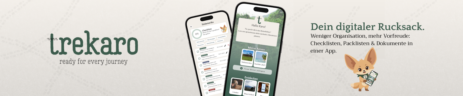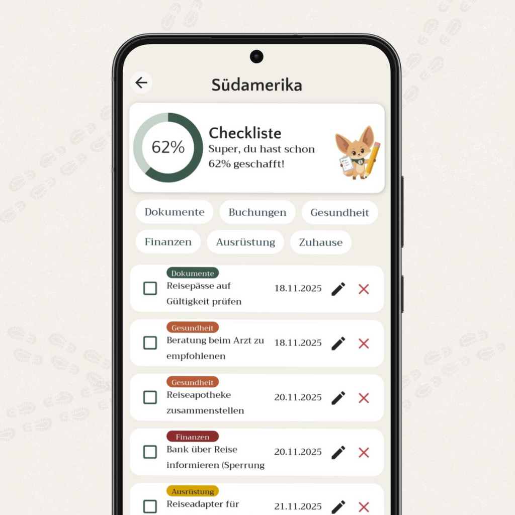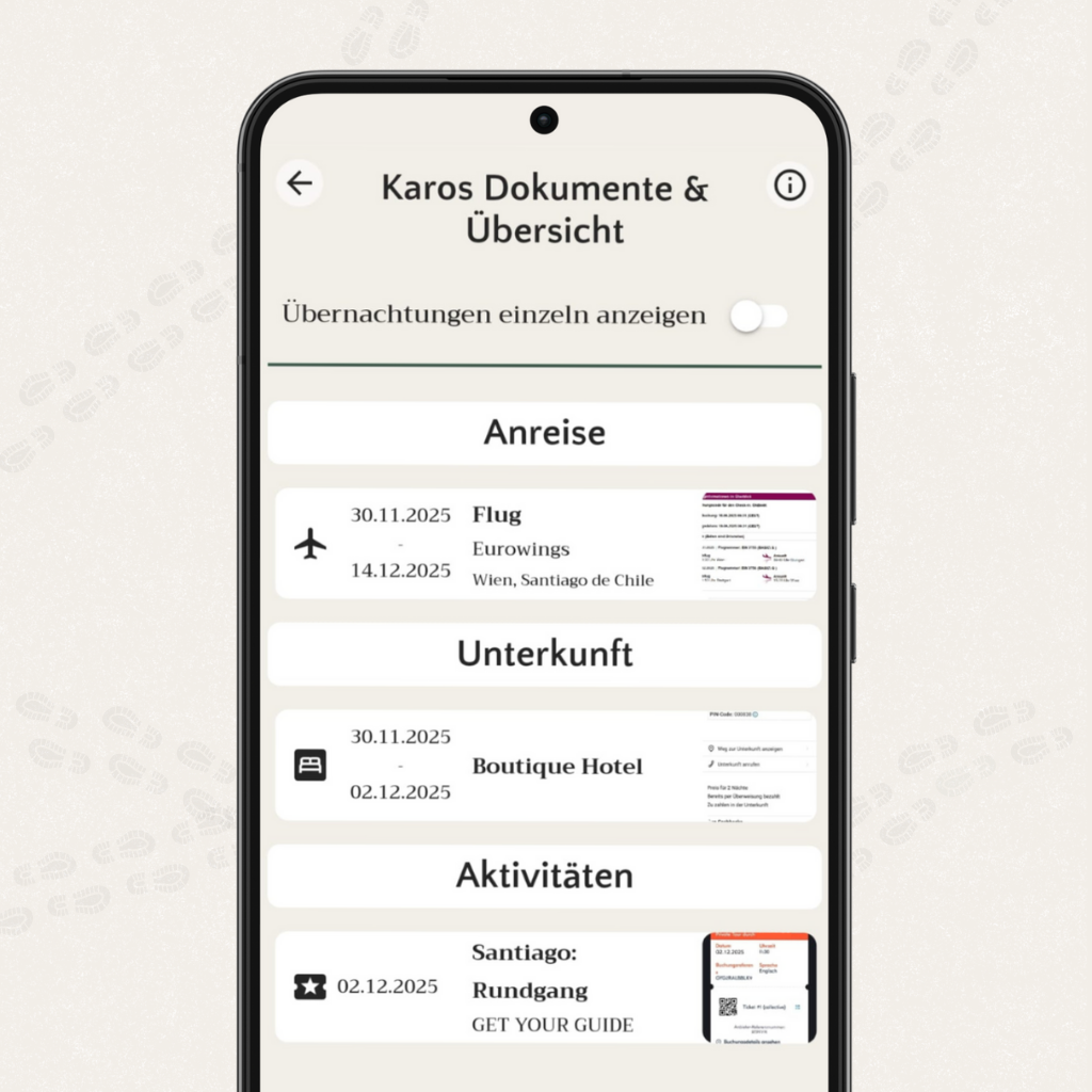 Mach’s dir einfach: trekaro räumt für dich auf. Als deine zentrale Reiseplaner-App bündeln wir Listen, Dokumente und To-Dos an einem Ort. Dein digitaler Rucksack hält Ordnung, damit du dich auf das konzentrieren kannst, was zählt: Die Vorfreude.