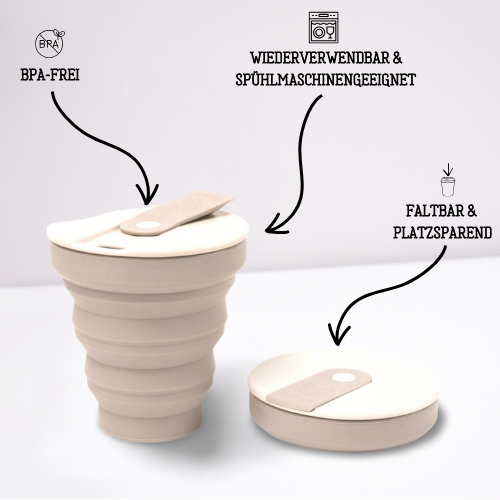 Entfalte die Tasse, fülle dein Lieblingsgetränk ein und genieße es unterwegs. Nach Gebrauch einfach zusammenfalten und platzsparend verstauen.