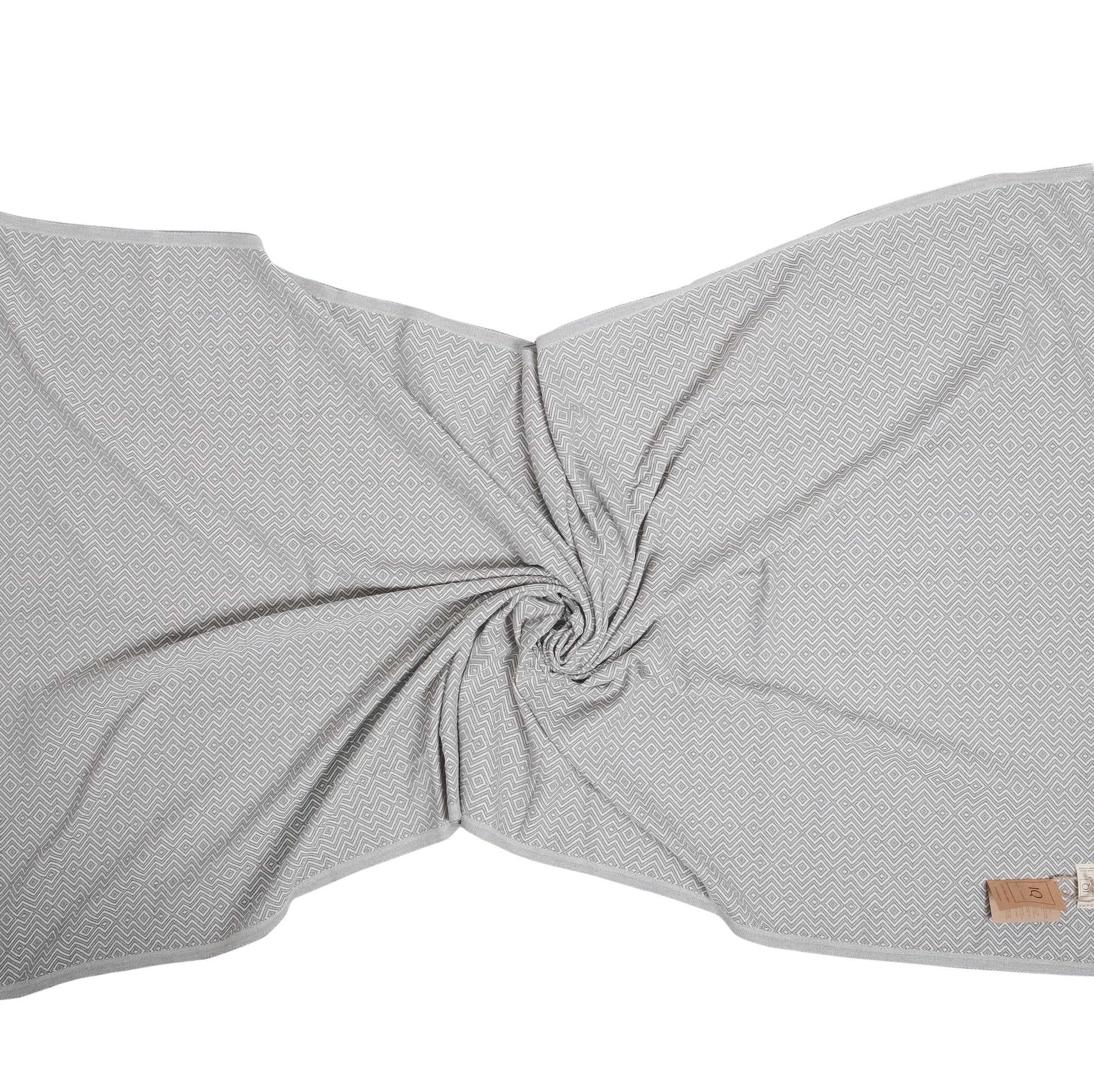 Das Tuch besteht aus 100 % Baumwolle, ist Oeko-TEX® zertifiziert und frei von Mikroplastik. Es ist leicht, saugfähig und schnelltrocknend – ideal für unterwegs. Die diamantartigen Muster und intensiven Farben in Grau und Bordeaux verleihen dem Tuch einen eleganten Look.