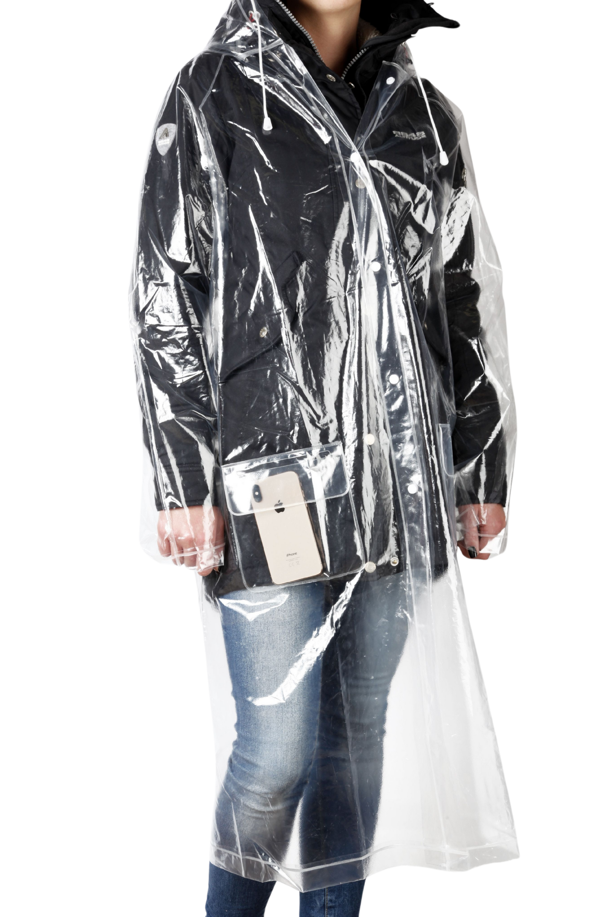 Mit seinem klaren, transparenten Design kannst du deinen modischen Stil auch an Regentagen zeigen. Die Kapuze mit Kordelzug und die langen Ärmel sorgen für Rundumschutz, während die zwei großen Taschen Platz für wichtige Dinge wie Handy, Schlüssel oder Geldbörse bieten.