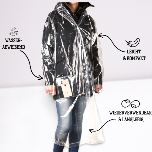 Mach dich bereit für jedes Wetter – mit dem transparenten, wiederverwendbaren Regenmantel. Bestelle jetzt und bleib trocken, egal wo du bist!
